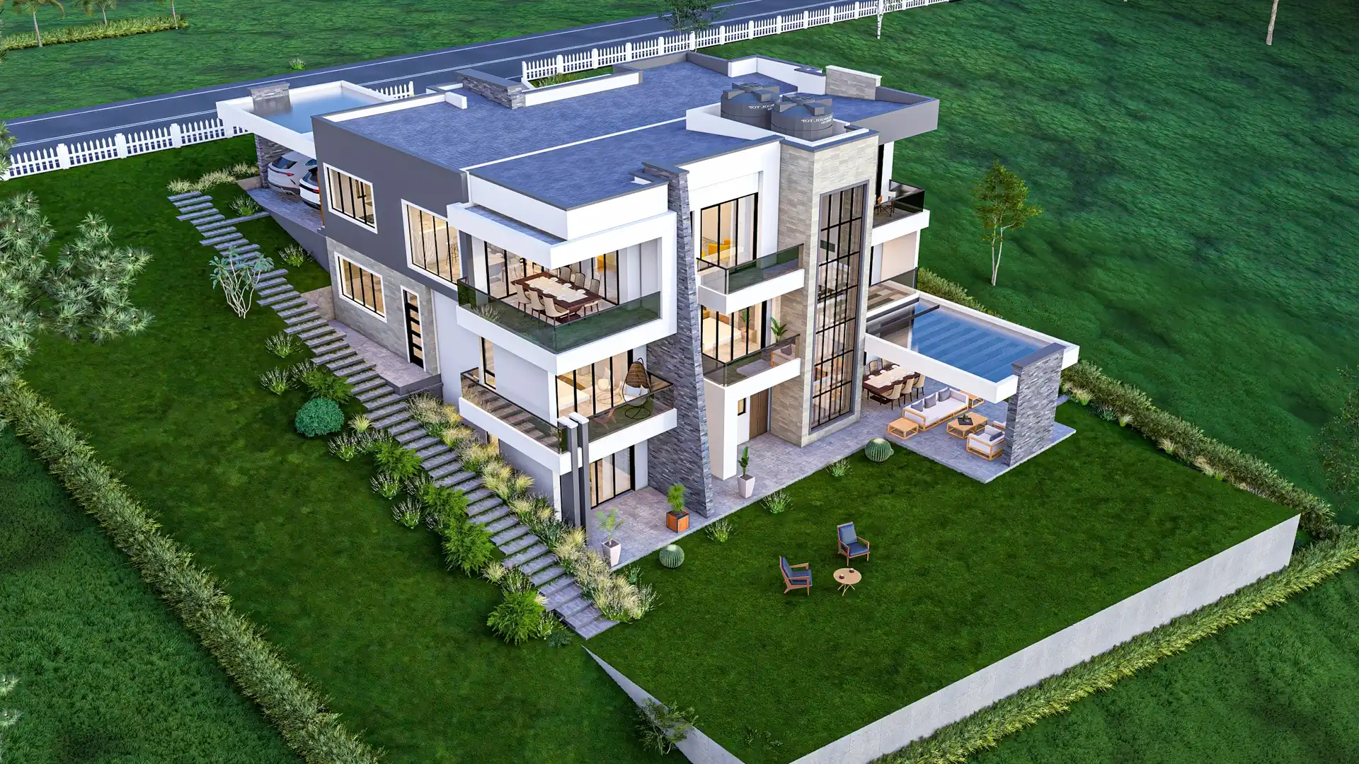 The home is positioned to create generous open ground, clear pedestrian approach, and protected parking. Outdoor lounges and poolside zones extend the living experience beyond the interior envelope.