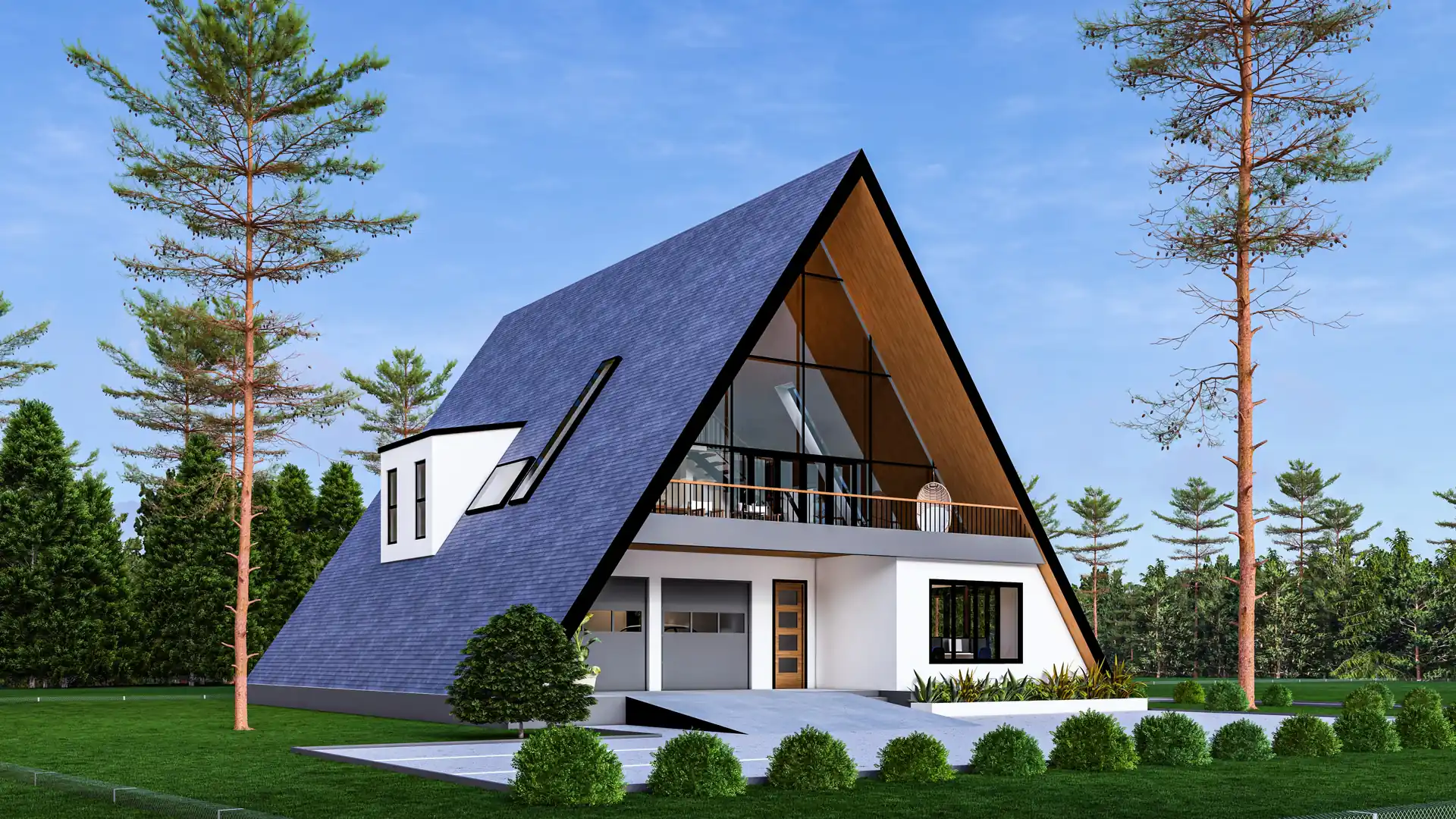 A-Frame Retreat is designed as a compact weekend home that maximizes volume within a simple structural form. The steep roof geometry sheds weather efficiently while creating a dramatic double-height social space facing the landscape.